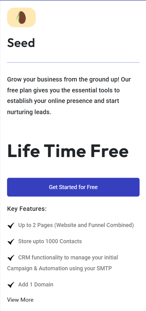 - Includes basic website builder, funnel creation tools, and essential automation features.