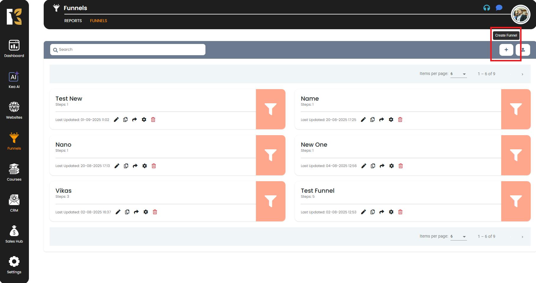 - On the top-right corner of the Funnels page, you’ll see a “+” button.