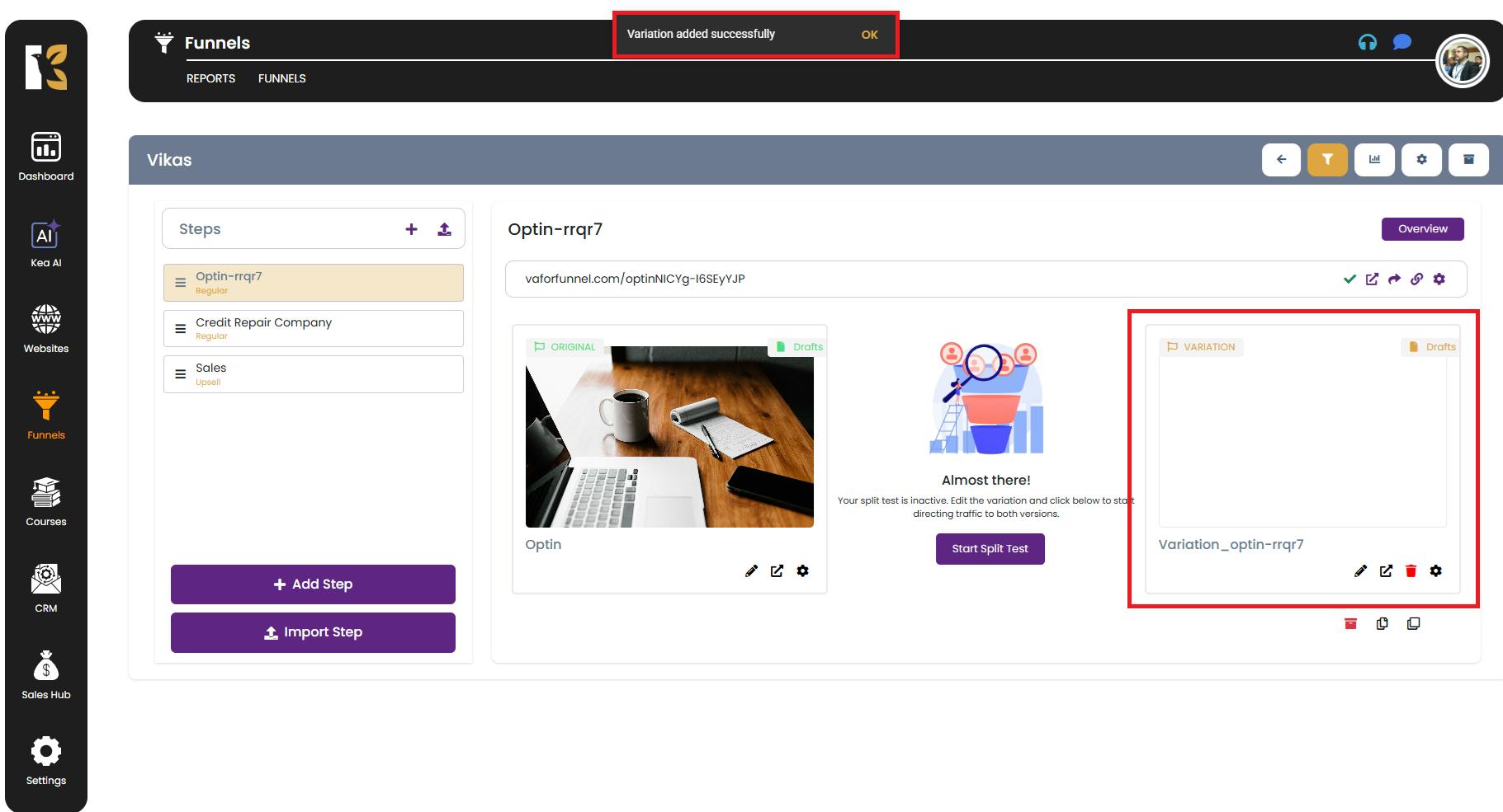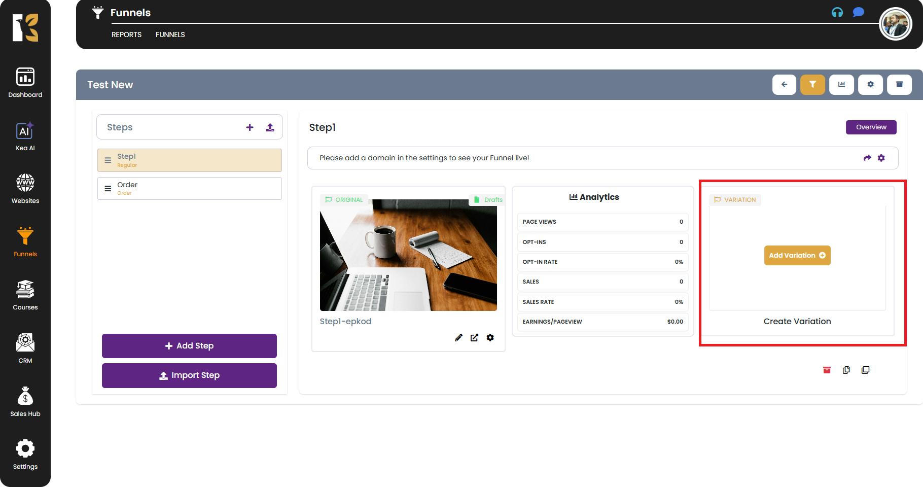 How to Create a Variation of Your Funnel Step in KeaBuilder