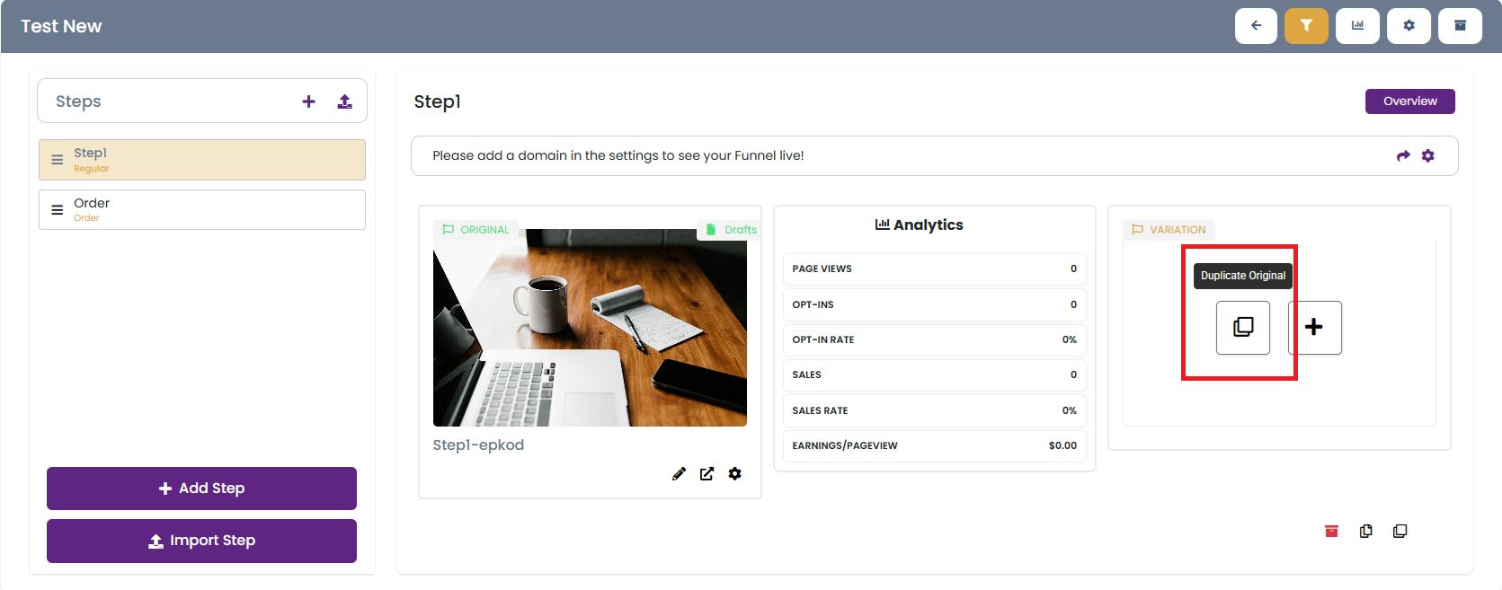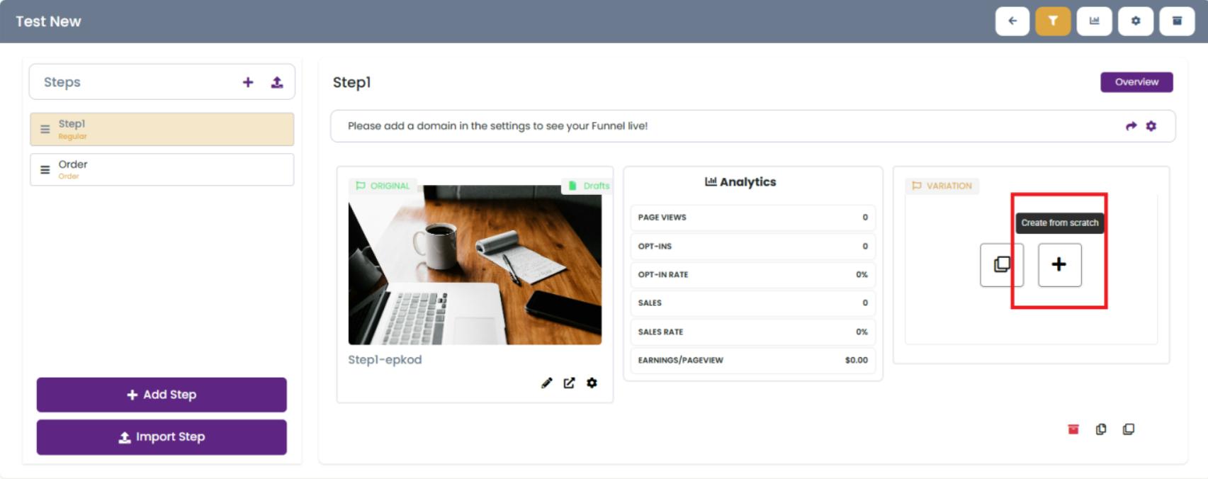 Creating variations of your funnel steps is an excellent way to test, improve, and optimize your funnels for better performance. With KeaBuilder, you can either duplicate an existing step to make minor edits or create a fresh variation from scratch using blank or pre-designed templates.