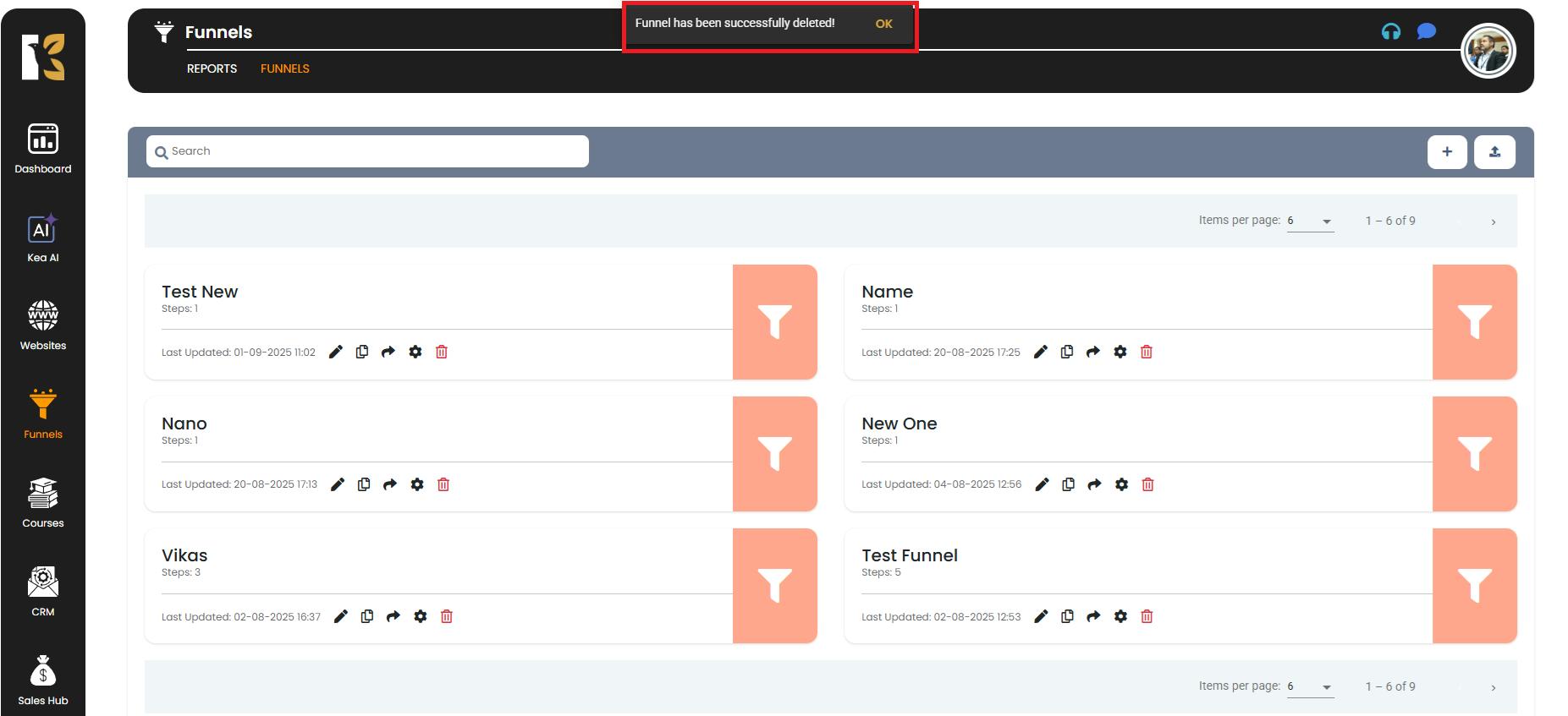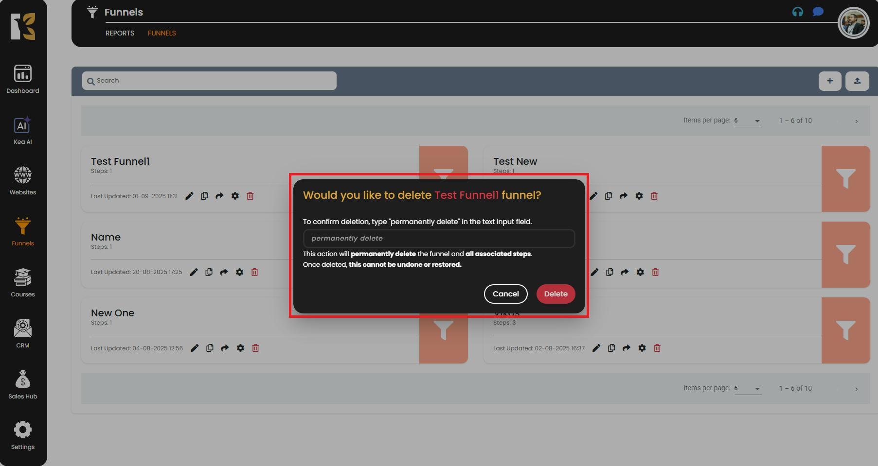 - KeaBuilder will verify and, once authenticated, will permanently delete the selected funnel.
