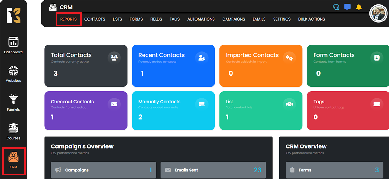 - This will open up your Customer Relationship Management section, where you can manage your leads, contacts, tags, and other CRM-related functionalities.