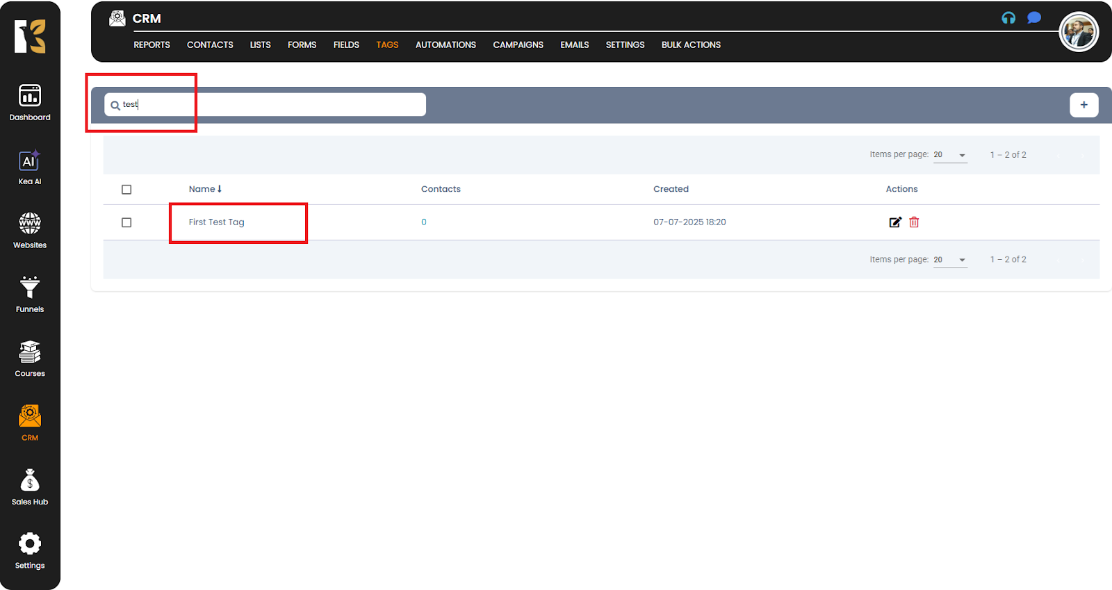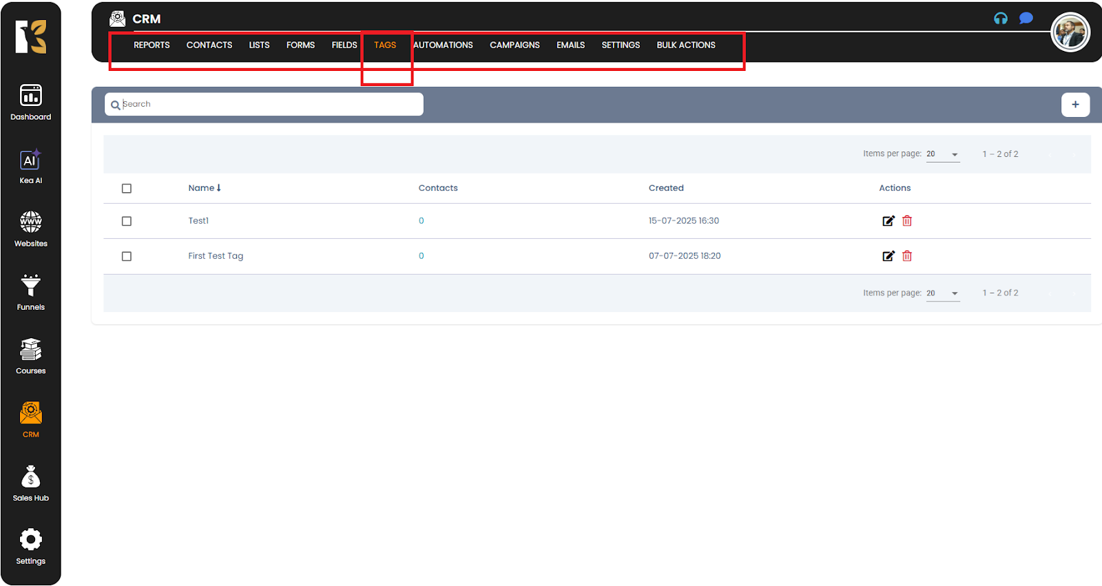 - Click on the “Tags” option to view and manage all the tags created in your CRM.