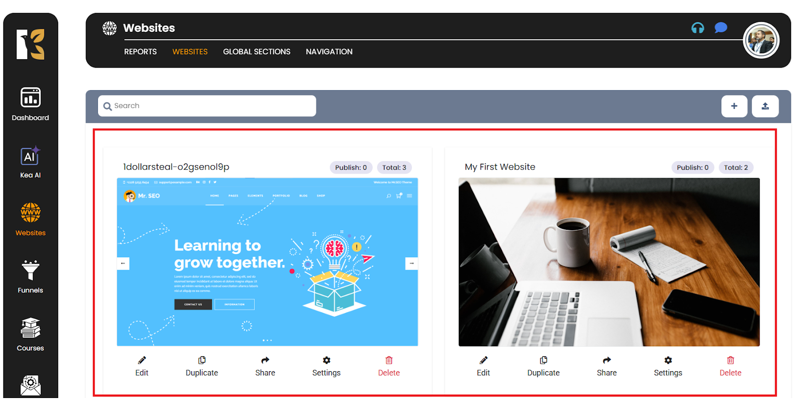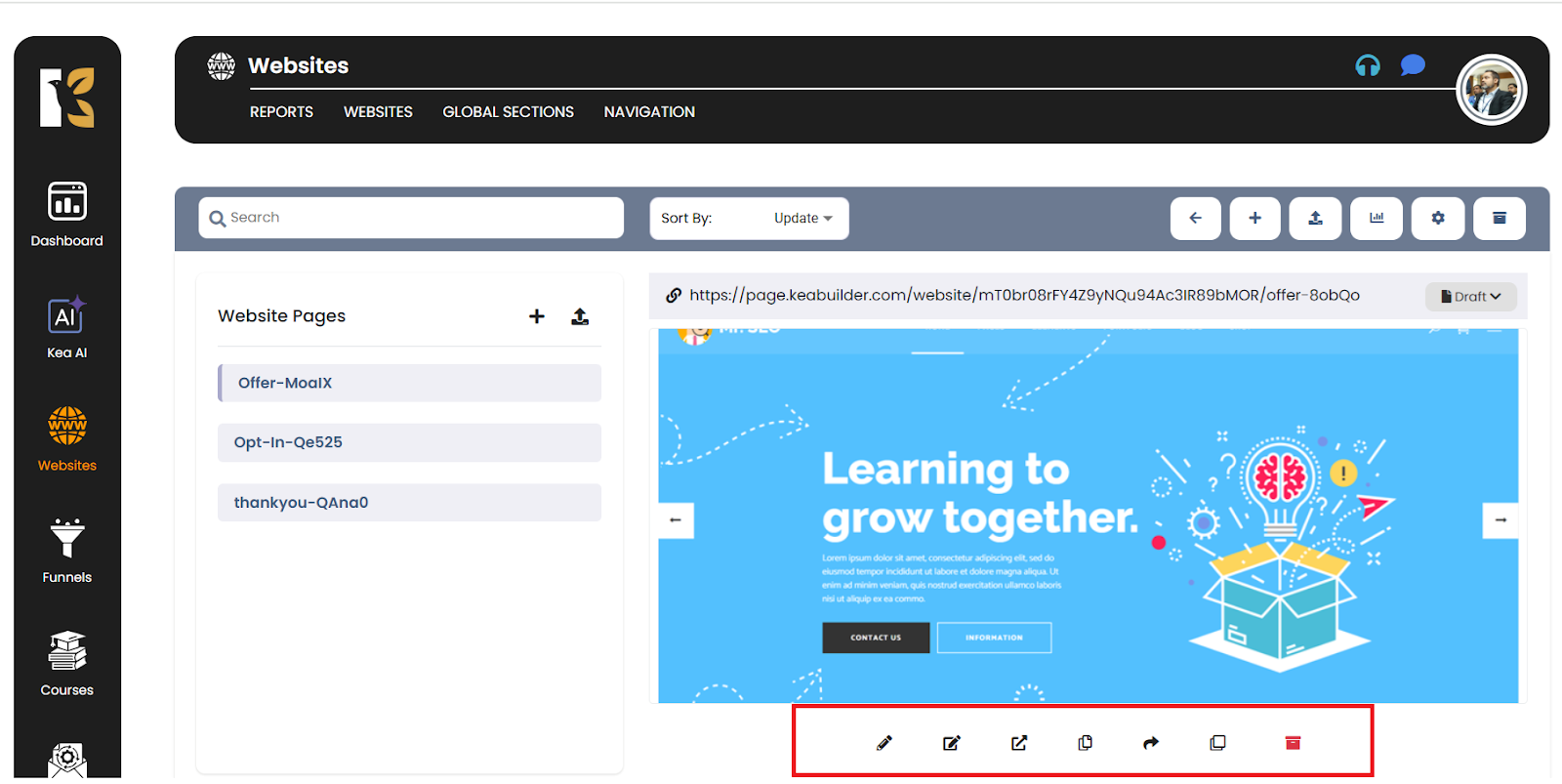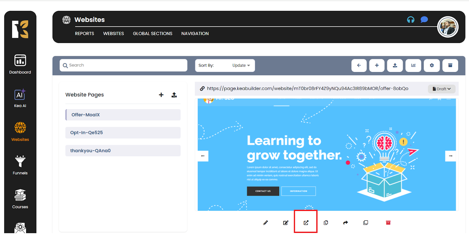 This guide will help you locate and manage all the pages associated with a specific website built using Kea Builder.